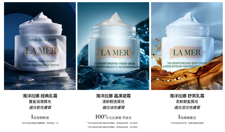 •  Crème de la Mer 經典乳霜/奇蹟乳霜修復乾燥、泛紅與敏感,長時間使用能有效改善細紋。適合敏感脆弱肌和乾肌。